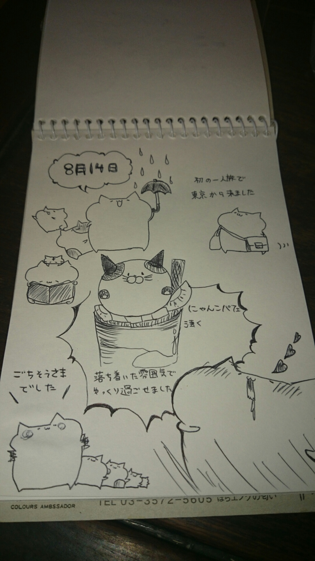 京都のにゃんこパフェを食べに来ました!パフェがくるまで結構時間がかかりそうなので机に置いてあった手帳に落書き